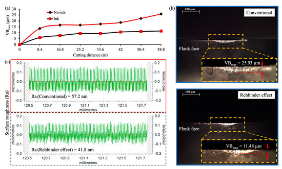 The wear progression of the tool under conventional cutting conditions presents the typical flank wear development plot where rapid wear initially occurs within a short time, followed by a stable progression and finally ending off with an acceleration before failure. The increased rate of wear under conventional cutting occurs as the cutting distance goes beyond 42 m. In contrast, the wear development under the mechanochemical effect remains as a gentle inclined gradient, which indicates that the tool has not reached the critical stage before failure. The wear land, defined by the maximum height of the wear marks (VBmax), is lower by 56% under the Rehbinder effect. Naturally, the lower tool wear led to a 27% improvement in the final surface roughness of 41.8 nm Ra as compared to 57.2 nm Ra under normal conditions (Figure 5b). The produced surface roughness is dependent on the cutting tool geometry (i.e., wear morphology) and tool-tip vibrations induced by the material microstructure characteristics [38]. Hence, the disparities in surface roughness are determined to be caused by the differences in tool profile as a result of tool wear and the enhanced material removal mechanism that reduces tool-tip vibrations.