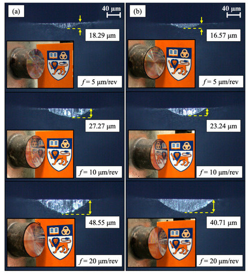 At higher feeds of 10 and 20 μm/rev, where shearing is the material removal mechanism, the reflected images appear to be clearer under the mechanochemical effect when compared with the surfaces produced by conventional cutting. In addition to the enhanced surface quality expected under the mechanochemical influence (Figure 5), the clearer reflections are also results of the reduced wear lands. As the wear land increase, the machined surface quality is expected to deteriorate due to the degraded tool geometry that could change the material removal mechanism. Nonetheless, diamond tool wear is reduced, regardless of the material removal mechanism, with increasing feeds from 5 to 20 μm/rev, corresponding to magnitudes of 9.4%, 14.78%, and 16.15%. In the meantime, it is good to note that the difference in percentage wear reduction between the two different wear tests is in the size of the nose-radius, where wear rates are often higher for smaller nose-radii [40].