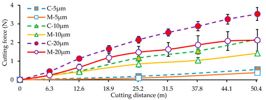 Machining force progression in diamond tool wear tests under conventional cutting conditions (C) and the mechanochemical effect (M) with feeds of 5, 10 and 20 μm/rev.