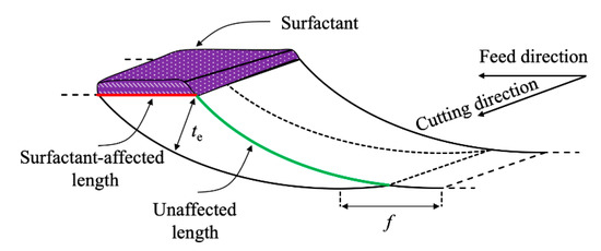 As the spindle revolution was kept constant throughout the tests with the 0.4 mm nose radii tools, the change in feed rate changes the feed per revolution, which determines (i) the effective area of the uncut chip thickness during turning and (ii) the surfactant-affected length as shown in Figure 8. These are two main factors that define the degree of influence that the mechanochemical effect has on the material response. The effective uncut chip thickness corresponds to the degree of plastic deformation during material removal, which would affect the performance of the mechanochemical effect. It was suggested that the physicochemical phenomenon is even more effective to cause embrittlement when dealing with ‘gummy’ metals that exhibit high plasticity during deformation and are challenging to cleanly cut [27]. Therefore, a thicker uncut chip thickness that should correspond to a higher degree of plasticity in the chips would call for a more significant influence of the mechanochemical effect. The geometrical aspects between the feed and the effective uncut chip thickness have been covered in detail by Chaudhari and Wang [29] and the principals may be applied to explain the different magnitude of tool wear reduction under the mechanochemical effect. In general, the increase in feed enlarges the effective uncut chip thickness and therefore improves the effectiveness of the mechanochemical effect due to the increase in plastic deformation.