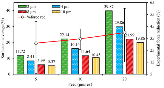 In the meantime, it may appear that larger feeds should be used during machining to a ensure wider coverage of the material under the mechanochemical effect, but the use of larger feeds would increase the theoretical peak-to-valley height of the machined surface and incur larger machining forces as observed in Figure 7. Hence, it is suggestive to say that there exists an optimal balance between low feeds for better surface finishing and the proportion of surfactant-affected material, which can be achieved through a series of systematic controlled tests involving a large quantity of cutting tools.