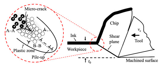 The explanation for the increase in microhardness can also be adapted to elucidate the results observed in microcutting, beginning with the adsorbed chip-free surface that undergoes embrittlement due to the influence of the surfactant. Malkin [24] describes this phenomenon of free surface generation as a favourable energy system to break the interatomic bonds in the bulk material and form interatomic bonds with the surfactant. Lee and Wang [23] applied this concept to propose the sequence of events along the primary deformation zone that leads to the embrittlement process. As shown in Figure 10, the dislocation activity is enhanced from the surface under the Rehbinder effect, due to the breakage of interatomic bonds of the work material and crack formation. Subsequently, dislocation pile-up occurs when the dislocations of increased density entangle with those emitted from the tool tip to result in strain localization within the chip. It is important to emphasize that the crack formation shown in Figure 10 only serves as an illustration of a simple crack geometry during embrittlement, along the primary deformation zone, and does not exemplify the mode of crack formation. In reality, not only does the embrittlement process involve a tensile stress component for crack-opening (i.e., stress intensity factor Mode I), but also the typical shear stresses observed during cutting that induce crack-sliding (i.e., Mode II). Understandably, Griffith’s relation (Equation (1)) describes macroscopic crack formations, while the surfactant-workpiece interaction manifests on the molecular level. At this scale, surface forces become increasingly influential towards the fracture stress, which then invokes the atomistic relationships in Equations (3)–(5) to explain the embrittlement process. Although it is unnecessary for microcracks to be present on the pre-machined surface, high stress concentrations due to the pile-up of dislocations along the shear plane and the favourable energy conditions would cause the nucleation of cracks on the free surface of the chip [26]. On the other hand, pre-machined surface defects will enhance the chemisorption interactions with crack tips [24] as well as the surfactant–workpiece interaction at the molecular level.