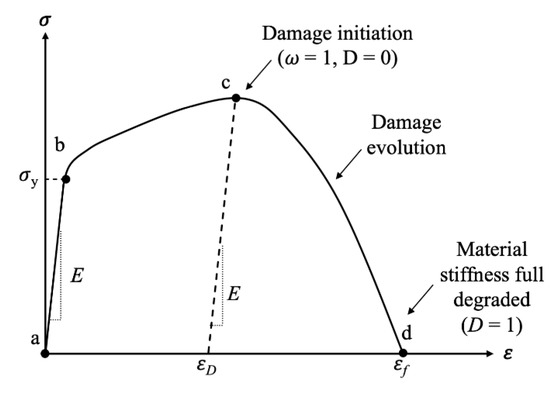 During deformation, the material stress–strain response comprises three main stages as illustrated in Figure 12. The region a–b comprises the linear elastic region that is governed by Young’s modulus and the yield strength, before enduring plastic deformation with strain hardening effects in the region b–c. The equivalent plastic flow stress during elastic–plastic evolution is described by Equation (6). Upon reaching the maximum load-carrying capacity, the material strength degrades in the region c–d before its eventual failure. This region follows the damage initiation and evolution laws in the J–C shear failure model described in Equation (7). Initiation occurs when the scalar damage parameter in Equation (8) exceeds the nominal value of 1: