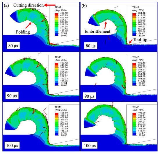 Simulated chip morphology and temperature profile under (a) conventional cutting conditions and (b) the mechanochemical effect.