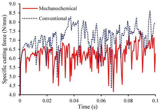 Plot of the theoretical specific cutting forces under conventional cutting conditions and with the mechanochemical effect.