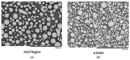 Particles of AlSi7Mg0.6 (a) and AM205 (b) obtained by gas atomization (SEM).