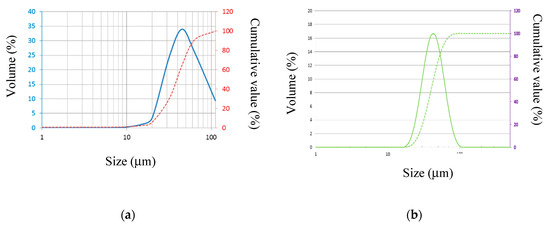Size distribution of (a) AlSi7Mg0.6 particles and (b) AM205 particles.