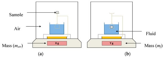 Principle of the Archimedes method: (a) the sample is first being weighed in the air (reference fluid) and (b) the sample is then being weighed in the second fluid.