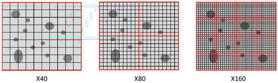 The choice of magnification for image acquisition is important on several levels. First, magnification determines the number of pixels in the image; the smaller the magnification, the smaller the number of pixels that make up the same surface area, as shown in the diagram in Figure 4. If magnification X40 produces a surface area S made up of a single image, for magnification X160, this will require 16 distinct images. The size of the pixel is very much reduced, thus making it possible to discern the smallest sized porosities, which could not be distinguished with a smaller magnification. In addition, the larger the magnification, the longer the acquisition and processing time for a surface area. Thus, the right compromise has to be reached to provide the desired accuracy in an acceptable time.