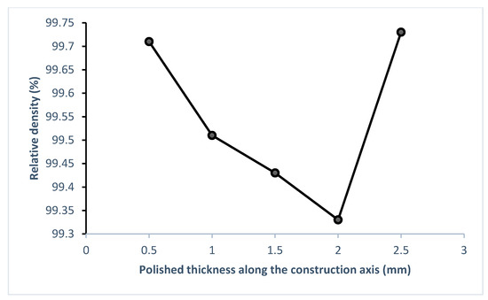 However, determining the relative density of a sample on the basis of calculating the porosity rate by image analysis of a polished section assumes that the 2D image is representative of the volume of the sample. In addition to the direction of the section, it is necessary to check whether the density results are dependent on the positioning of the section studied. To do this, a series of analyses were carried out along build axis z in 0.5 mm steps obtained by successive polishing of the section along a length of 3 mm. The average relative density obtained from 3 images using the procedure previously described varied from 99.3 to 99.7% (Figure 6), which shows that the position of the section seems to be an influencing factor on the resulting relative density in agreement with the results of De Terris and all [10].
