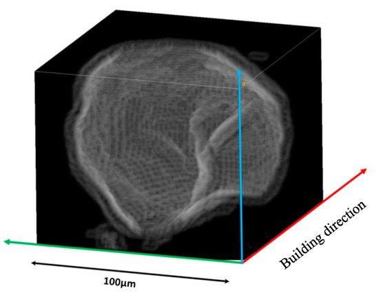 X-ray absorption tomography is a non-destructive control technique that reconstructs cross-sectional images of a three-dimensional object. With the progress in computers and optical equipment, a resolution of the order of one micron can now be achieved. The equipment used is a high-resolution Versa 500 Zeiss micro-imaging system, able to obtain images with pixels of 0.15 µm and voltages of up to 160 kV. Tomography is a means of characterization that can reveal porosities within materials. It can locate porosities and describe their geometry. For example, this tool is used to characterize SLM-produced parts made of nickel alloy [14] or titanium alloy [11,15]. Maskery et al. used this tool to study the influence of heat treatments on the distribution and geometry of porosities, for SLM-produced parts made of Al–Si10–Mg [12].