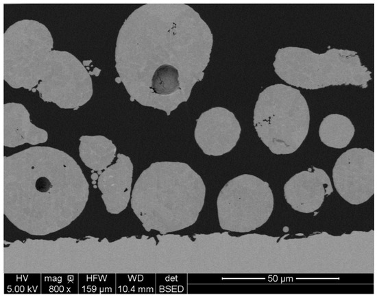 This then raises the question of the choice of reference. In the literature, even in very recent studies, this choice is never discussed [10,18]. Yet this is an important question because the value of the theoretical density has a strong influence on relative density. In the case of the AlSi7Mg0.6 alloy, we can assume that the reference is the foundry alloy and hence that ρtheoretical = 2.68 [19]; however, we note that the composition of the foundry alloy and that of the powders are not perfectly identical (Table 1). We might then consider taking the powder material as the reference, as it has the same composition. In this last case, density ρtheoretical is the density of the powders, which is determined by helium pycnometry. However, the value obtained (2.66) is characteristic of the powder, while the particles of this powder have very clear porosities, as demonstrated by micrographic observation (Figure 8). The measured value is therefore not an intrinsic value of the material that makes up the powder and cannot therefore be selected as a reference.