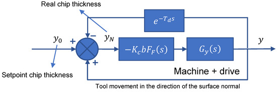 In this paper, a model of the directional dynamic properties of a CNC vertical machining center, including the feed drive control, is developed and used for the analysis of the impact of feed drive control setting on the machining stability limits. The machining center is equipped with linear motors on the XY cross table. The model of machine tool dynamics is considered as a sum of the spindle and XY cross table parts, including the X and Y axis feed drive control. The schematics of the feedback regenerative principle of real chip thickness resulting from the interaction of machine tool structural and control dynamics, expressed by the overall compliance , with cutting process, expressed by cutting force coefficient , chip thickness , and as the additional transfer function, expressing the dependency of on process parameters [18], is illustrated in Figure 1. The input to the feedback scheme is setpoint chip thickness.