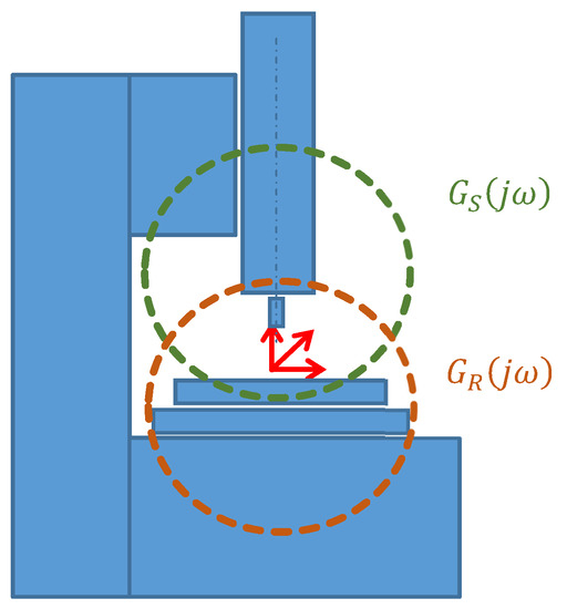 The XY cross table dynamic system can be divided into the mechanical structure part described by the transfer function and the feed drive control part described by the transfer function. The overall dynamic compliance is expressed as a sum of the structural and control parts, as indicated by Equation (2). The overall is evaluated in the XY plane, thus enabling evaluation of the most critical direction of machine tool dynamic behavior with respect to the directional dynamic compliance. At the same time, is used to evaluate the impact of X and Y motion axis feed drive control parameters on the stable cut limits. The procedure of obtaining the directional dynamic compliance of the machine tool mechanical structure at a spindle and XY cross table is described in the following chapters.