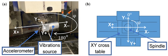 A model of directional dynamic compliance of the spindle unit is developed based on measurements. Direct dynamic compliance measurements were executed in parallel with the XY cross table with the use of an electric-dynamic vibration source and one-axis accelerometer. This process is deemed more reliable compared to the use of a modal hammer. The measurements were taken starting in the negative direction of axis Y and proceeded in the 1° step in the clockwise direction (Figure 4). Every single measurement consisted of the force excitation by the sinusoidal harmonic signal with an amplitude of from to by the step of . Data acquisition at each frequency was performed until the steady state was reached, with a pause of before the subsequent measurement.