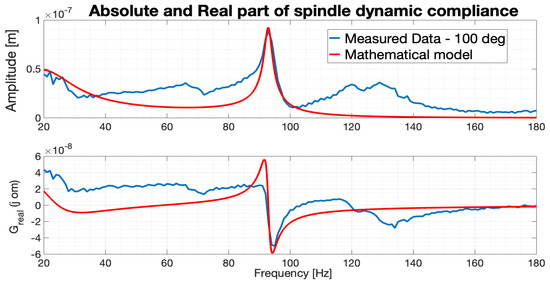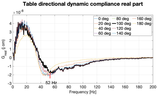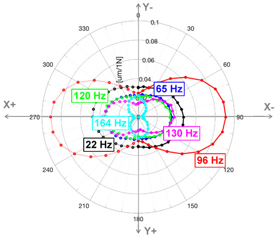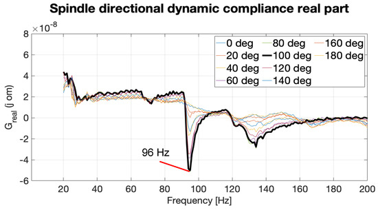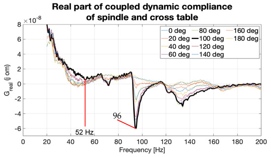 In general, the 3D space one-mass model of the spindle, which was described in chapter 0, is simplified to a model with two degrees of freedom for the purpose of modeling the dynamics of a vertical machine in the XY plane (see Figure 4). In Equation (3), therefore, it is considered for . Figure 13 shows the real part of direct frequency dynamic compliance depending on the direction of . The real part minimum is found approximately at for the 100° direction.