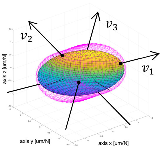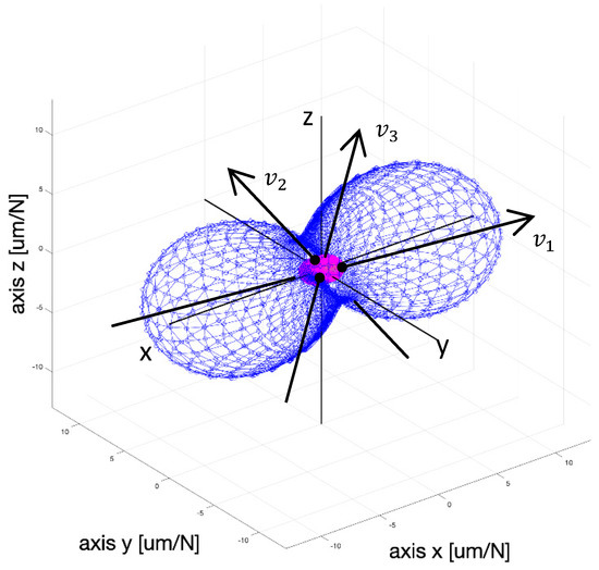 By substituting for in Equation (3), the surface of direct static compliance can be obtained. There are six points of contact touching the embraced non-rotary ellipsoid of compliance (see Figure 7) where the real force application points are when the 3D space force is applied in the whole spherical steradian range (this could be described as a certain form of Lamé’s stress ellipsoid used in the analysis of the tension tensors in the classical flexibility theory applied to homogenous materials).