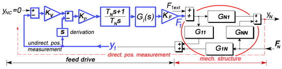 The coupled system of mechanics and feed drive control, described by the transfer function matrix GR (s), with inputs on the motor F1ext and on the N-mass FN and with corresponding outputs y1 and yN, is expressed by the diagram in Figure 12.