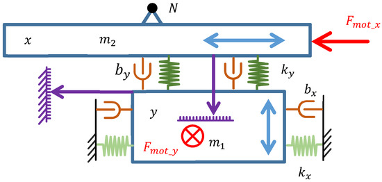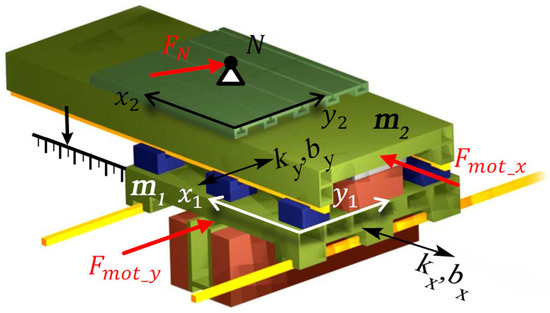 More complex mechanical structures can be described by a N-mass model, as illustrated in Figure 10. The motor input force is denoted as , excitation force used for feed drive diagnostics is denoted as , and the machining force acting at the mechanical system end point is denoted as .