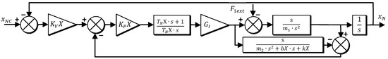 The motion axis block scheme is shown in Figure 11. The complete current control is labeled by symbol only. N-mass system dynamics is represented by the quadrupole, which is composed of the transfer functions in Equation (6).