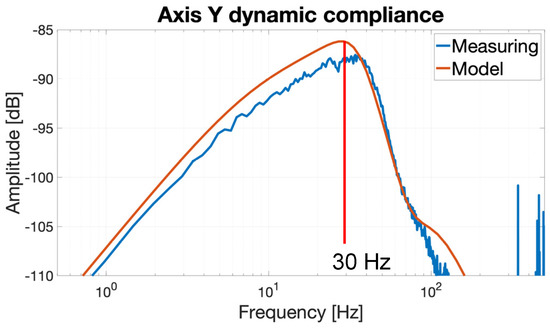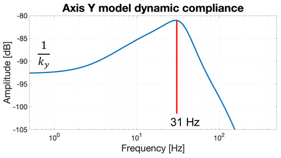 The two-mass model with the indirect position measurement is applied on the Y axis, shown in Figure 15 (the block diagram is identical to that shown in Figure 11). Transfer function is experimentally determined for the following parameters , , and obtained from the Sinumerik control system and the results can be seen in Figure 18. The experimental measurement is performed through the user interface of the Sinumerik machine control system using the disturbance frequency response type of measurement. A mathematical model is developed based on the motion axis mass values. The mathematical simulation is then obtained and compared with the measured values. The reconstructed transfer function (based on Equation (14)) is shown in Figure 19. Mechanical parameters are again obtained from [19] and summarized in Table 2.