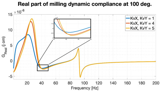 Identification for one direction of machining is processed. The angle of 100° was selected, see Figure 5, to demonstrate the influence of the feed drive parameters’ control on the overall stability in the machining process. Based on Formula (1) the critical depth of chip is determined by the minimum of the transfer function real part. Figure 23 shows a slight change in the lower frequencies (approximately ) based on the different constant tuning.