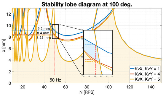 A construction of the resulting stability based on the feed drive parameters’ control of the SLD is shown in Figure 24. The shift is seen in the limiting depth of the cut based on the feed drive parameters’ control; in the presented case, the velocity regulation gain is applied. The critical depth of cut is given by the global real part minimum shown in Figure 23 for the frequency, approximately . The influence of feed drive parameters is seen in the area of .
