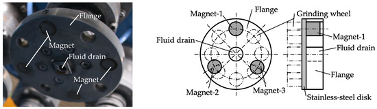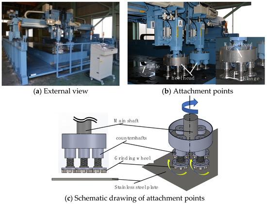 As no wet grinding machine for large stainless steel sheets currently exists, we developed a prototype based on an existing dry grinding machine. To determine the prototype specifications, we studied specifications such as spindle speed, grinding wheel feed rate, and working fluid supply. Figure 1 shows an external view of the developed wet grinding machine and the attachment points for the grinding wheels. The machine was built following the gantry style with a raised frame. The machine dimensions are 2800 mm (maximum height) × 4750 mm (maximum width) × 9260 mm (maximum length). The maximum size of the workpiece to be ground is 16 mm thick × 1524 mm wide × 6100 mm long. The machine is equipped with two main shafts, and each shaft has four countershafts. The countershafts are passively rotated by the active rotation that is transmitted by the gears of the main shafts, which are directly connected to the motor. The spindle speed can be increased from 39.5 to 395 rpm with a gear ratio of 1:1. The movement of the grinding wheel is implemented as epicyclic rotation, which reduces the unevenness of the finished surface and improves grinding efficiency. The number of main shafts to be used is selectable, and each can be controlled independently from a control box. The grinding wheel is fixed with an adhesive to a stainless steel disc (SUS430, JIS) with a diameter of 150 mm and a thickness of 2 mm. The grinding wheel head at the tip of the spindle is equipped with four flanges with a 150 mm diameter. As shown in Figure 2, a magnet is embedded in the flange, making it easy to detach the stainless steel disc jig to which the grinding wheel is attached, thus reducing the labor required to change the grinding wheel. The spindle speed, the feed rate of the gantry unit, and the feed rate of the grinding wheel head are controlled through an inverter. Moreover, the control box allows for the configuration of various settings. The gantry unit runs on a rack gear drive, with the gear shifting performed by an inverter. A motor-driven screw jack system drives the grinding wheel head. The feed rate of the gantry unit can be set from 0.01 to 0.5 m/s, and the feed rate of the grinding wheel head can be set from 0.01 to 0.2 m/s. The grinding solution uses tap water without mixing additives. The grinding fluid drains at a rate of approximately 3 L per minute from the center of the main shaft, as shown in Figure 2. The grinding fluid is filtered and recirculated. As only tap water is used, the waste treatment is less burdensome and the environmental impact is smaller than that of using chemicals. The grinding fluid also prevents thermal deformation and dust dispersal, removes the swarf, and reduces the processing heat. The pressing force of the grinding wheel is controlled by air pressure to provide an appropriate pressure and allow for grinding along the curvature of the material. The grinding wheel head pressure operates between 0.1 and 0.4 MPa.