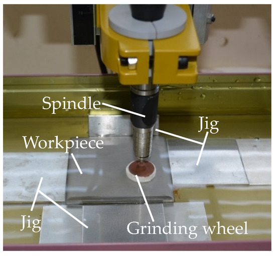 Figure 3 shows the machining part of the wet tabletop grinding equipment designed to select the optimum grinding wheel for the wet grinding of a stainless steel sheet. It serves as a model of the grinding wheel mounted on the large grinding machine, as shown in Figure 1. The grinding wheels used in the experiment were commercially available grinding wheels that were cut into a cylindrical shape with a diameter of approximately 25 mm and a thickness of approximately 5 mm. The grinding wheel was glued to the flange shaft, and the shaft was held using a collet chuck inside the spindle. The spindle was fixed to the stand of the grinding machine. The rotation speed of the spindle was set through the controller. A constant in-feed pressure was applied only in the z-axis direction of the table; thus, no motions along x- and y-axes were provided. This surface pressure was calculated by measuring the pressure with a three-component dynamometer installed on the table. The workpiece was stainless steel (SUS304, JIS). This steel sheet was fixed with a jig inside a water tank mounted on the table, while the tank was filled with sufficient tap water to immerse the surface of the steel sheet. The grinding time was set to 1 min. Each grinding wheel performance was evaluated in terms of the abrasion loss on the grinding wheel and the surface roughness of the steel sheet. The grinding conditions were set at a spindle speed of 12,000 rpm and an average surface pressure of 14.7 kPa along the z-axis. The dimensions of the workpiece were 80 × 80 × 8 mm. The surface roughness of the steel sheet was measured using a surface roughness measuring instrument (Mitutoyo SJ-410); the arithmetic average height of the assessed profile before grinding was Ra = 3.0 μm.