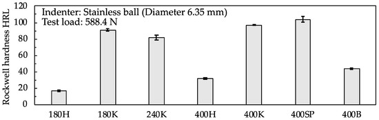 Figure 4 shows the Rockwell hardness measurements of the grinding wheels. A steel ball with a sphere diameter of 6.35 mm was used as the indenter, and the test load was set at 588.4 N. The hardness of the sponge grinding wheel was approximately 100 HRL. This value corresponded to the hardness of K for a vitrified bond. The hardness of the resin-bond grinding wheel (approximately 40 HRL) was slightly higher than the degree of hardness (400H) of the vitrified bond.