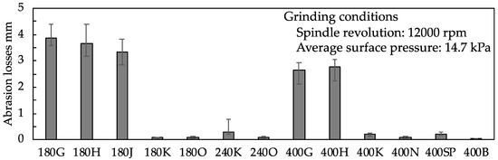 Figure 5 shows the average abrasion loss of the grinding wheel thickness after grinding. We conducted three trials for each type of grinding wheel and then calculated the average abrasion loss from the abrasion losses of the three grinding wheels. Before grinding, the thickness of the grinding wheel was 5 mm. For the vitrified grinding wheels, the abrasion loss was the highest with hardness values of G, H, and J and the smallest with a hardness value of K. Regarding the abrasion condition of the grinding wheels during grinding, those with hardness values of G, H, and J wore out immediately after the start of machining. The resin bond and sponge grinding wheels exhibited less abrasion loss than the vitrified grinding wheels.