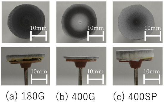Figure 6 shows the conditions of each wheel—180G, 400G, and 400SP—after machining. After grinding, the surface of the grinding wheel was almost level. The grinding wheels were worn down almost evenly because of the uniform application of the indentation load. Their original thickness of the 180G and 400G grinding wheels changed substantially. In contrast, the thickness of the 400SP wheel was approximately the same as before machining. Moreover, the entire surface of the grinding wheel was stained gray. The staining of the surface suggested the adhesion of the swarf to the pores.