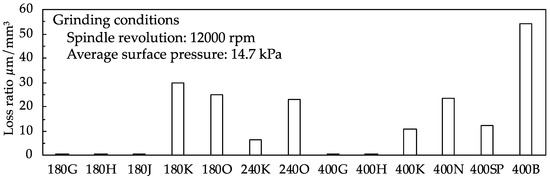 Figure 7 shows the loss ratio of each wheel. For the vitrified grinding wheels, the loss ratio was the smallest for the wheels with the lowest hardness values. Moreover, the ratio was the highest for grinding wheels with the highest hardness values. When the grain size was different but the hardness was similar, the loss ratio did not show much difference. To the extent that the loss ratio could be interpreted as the grinding performance, the wheels with the highest hardness values had the best grinding performance. The loss ratio of the 400SP wheel was almost the same as the 400K wheel. Moreover, the 400B wheel presented the highest loss ratio. The amount of improvement in surface roughness was slightly less than that for the sponge wheel; however, it was affected by the difference in the abrasion loss on the grinding wheels.
