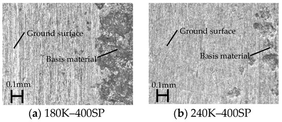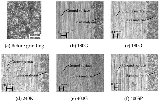 Figure 8 shows the surface properties of the stainless steel sheet. A digital microscope (Keyence, VHX-500) was used to observe the surface of the steel sheet. Figure 8a shows the surface condition of the stainless steel sheet before grinding. This steel sheet surface had a No. 1 finish and was cleaned with acid after heat treatment. In other words, the surface was etched with acid. Figure 8b–f shows the surface conditions after grinding for the 180G, 180O, 240K, 400G, and 400SP wheels, respectively. The observation point was set near the outer circumference of the wheel. Scratch marks from the abrasive grains were clearly visible on the surfaces machined with the 180G, 180O, 240K, and 400SP wheels. Clear boundaries were present between the areas subjected to grinding and those that were not. Moreover, few scratch marks were present on the surfaces machined with the 400G wheels.