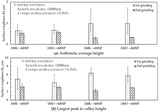 First, for rough grinding, the 180K, 180O, 240K, and 240O grinding wheels, which had large amounts of shavings on the etched surface, were selected as candidates. After rough grinding with this grinding wheel, semi-finished grinding was performed using the 400SP wheel. Figure 9 shows the arithmetic average height (Ra) and the largest peak to valley height (Ry) of the assessed profile of the steel sheet after grinding it with the four candidate wheels for rough grinding and the 400SP wheel for semi-finish grinding. When rough grinding was performed, the grinding wheels with smaller grain sizes minimized the surface roughness. Subsequently, when semi-finish grinding was performed, the grinding wheel with a larger grain size minimized the surface roughness. When machining to a #180 finish, the in-feed was very deep, creating deep scratches in the steel sheet. Additionally, the 400SP wheel could not be machined to the depth of the scratches. The grinding wheel combinations that could reach a surface roughness of approximately Ra = 0.3 μm were the 240K–400SP and 240O–400SP combinations.