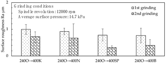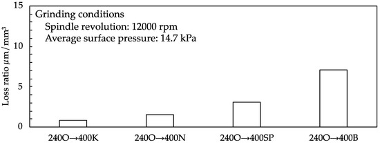 Figure 10 shows the loss ratios for rough and semi-finish grinding. To calculate the loss ratio, we first obtained the arithmetic average height of the assessed profile when grinding with the 400PVA rough grinding wheel. Subsequently, we divided this number by the added abrasion loss, which we obtained by summing the abrasion loss on the rough grinding wheel and the abrasion loss on the 400PVA wheel. Even though the 240K–400SP combination improved the surface roughness the most, it had the lowest loss ratio at 5.19. This was because the added abrasion loss was high. The 240O–400SP combination had the highest loss ratio at 8.70, and its surface roughness was Ra = 0.319 μm, similar to the 240K–400SP combination. Here, the added abrasion loss was 0.09 mm. By comparing the loss ratio, it was possible to estimate the combination in which this value became smaller.