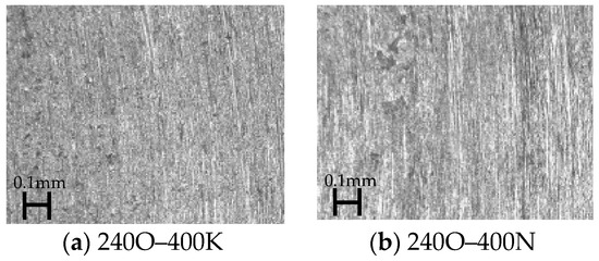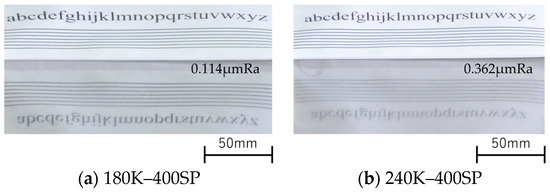 Figure 11 shows the condition of the steel sheet after grinding with the 180K–400SP and 240K–400SP combinations. The 180K–400SP combination left scratch marks on the steel sheet surface, while the 240K–400SP combination left the surface virtually scratch-free. Scratch marks should be removed by re-buffing, which means that another round of grinding is required. If the scratch marks are very deep, the product is considered to be defective. The loss ratio of the 180K–400SP combination was higher than 8. We decided to exclude it from the selection based on the final finish condition, which showed scratch marks.