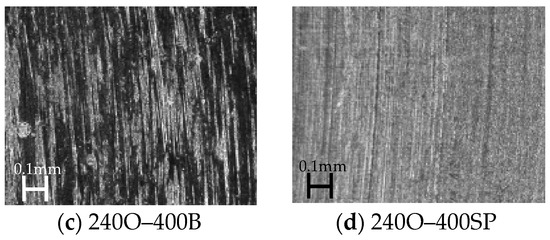 Figure 13 and Figure 14 show the loss ratios and steel sheet surface conditions, respectively. To calculate the loss ratio of each semi-finish grinding wheel, we first obtained the arithmetic average height of the assessed profile when grinding with the wheel after rough grinding with the 240O wheel. After that, we divided this number by the added abrasion loss, which we obtained by summing the abrasion loss on the 240O wheel and the abrasion loss on the tested grinding wheel. The 400B wheel exhibited a small abrasion loss and presented the highest loss ratio. However, comparing the steel sheet surfaces after grinding, the 400B wheel left several scratch marks. Moreover, the vitrified grinding wheels left almost no scratch marks on the machined surface, and the loss ratios were smaller than those of the other wheels.