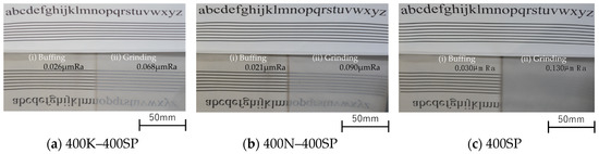 Figure 16 shows the surface condition and roughness when grinding with the 400K–400SP, 400N–400SP, and 400SP combinations; the condition after buffing is also shown. The number of grinding sessions was set to 3 for the 400K, 400N, and 400SP wheels. Buffing was performed until the steel sheet was glossy, and no scratches were found on the steel sheet surface after buffing. The surface roughness was also very low. When only the 400SP wheel was used, 15 grinding sessions were required to achieve a similar grinding surface. Though it required more and longer grinding sessions, the No. 1 substrate was machined, and the surface roughness was low, with almost no fine scratches observed. Considering the machining quality, efficiency, and cost, grinding with various #400 wheels was found to be superior when using a single 400SP wheel.