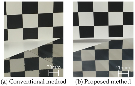 Figure 17 shows the machined surfaces under the conventional method (dry machining) with a flap wheel and the proposed method (wet machining) with the 400SP wheel. In both cases, gingham checks were reflected on the steel sheet surface. Note that the checks in Figure 17a appear distorted. Moreover, the checks in Figure 17b are clearly visible. The proposed method appears to have caused less distortion on the steel sheet surface than the conventional method.