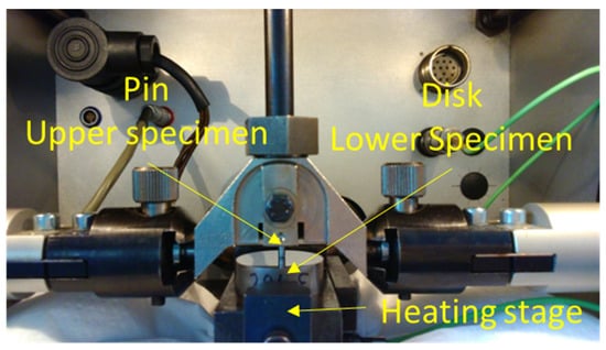 The study of the friction and wear behavior has been carried out with a reciprocating sliding friction and wear tester (SRV) model 8.110. The SRV device is provided with an electromagnetic drive, which allows the upper specimens (2011 and 6026 pins) to oscillate under normal load against a stationary lower test specimen (the three tool materials), as shown in Figure 3. The SRV tribometer has a servo motor, which is used to apply the selected normal load. The conditioning of the disks at the selected temperature was done by means of a heater placed in the lower test specimen holder. During each test, the applied load, temperature, stroke length, and frequency of the oscillatory movement were controlled and monitored with the computerized data acquisition and control system of the device.