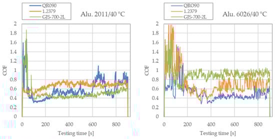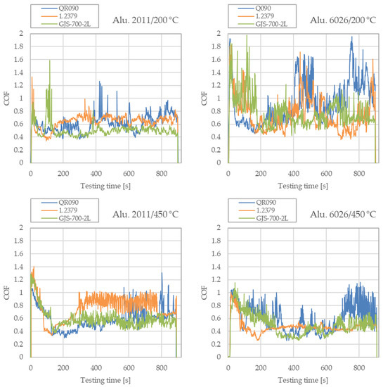 The curves show that in most cases, the COF tends to stabilize after an initial transitory of approximately 200 s and, once stabilized, the COF is in the range between 0.5 and 0.9. Similar results were observed by other authors in similar tests involving H13 hot work steel and 2017 aluminum [20].