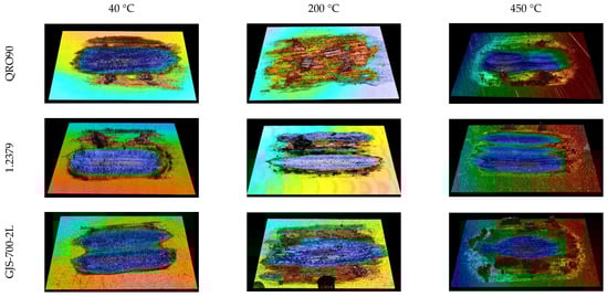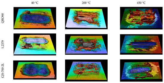 Starting with Figure 5, corresponding to the 2011 pins, it can be seen that wear tracks are mainly grooves with minor adhesion for the tests at 40 °C. The column corresponding to 200 °C shows an increased adhesion compared to 40 °C tests, especially for the hot work tool steel. This fits with an increased tendency to adhesion with temperature, promoting galling. Finally, the test surfaces at 450 °C look similar for the three die materials, with the exception of a higher amount of debris in the track border for the hot work tool steel and the cast iron. This points to the shear stresses and wiping the adhered aluminum debris out of the test track.