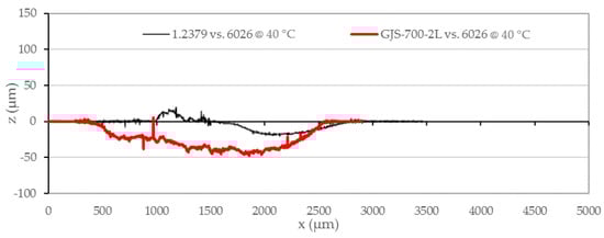 Depth profile of the track. Tool steel vs. cast iron wear profile comparison at 40 °C.