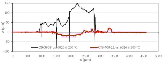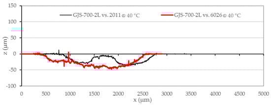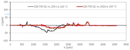 Depth profile of the track. Comparison between GJS-700-L2 disk profiles for tests against 2011 and 6026 at 200 °C.