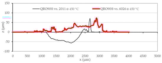 Depth profile of the track. Test carried out at 450 °C showing how QRO90® disks suffered galling with 6026 pins, but adhesion was much lower with 2011 pins.