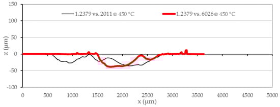 Depth profile of the track. Test carried out at 450 °C with 1.2379 and both 2011 and 6026.