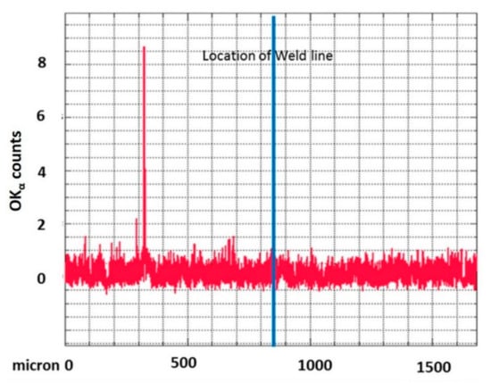 α line scans that were acquired across the weld line of weld W9. The line scan shows an oxygen peak from an oxide particle 0.5 mm away from the weld line, but no oxygen was detected at the weld line itself, neither in this nor in the other line scans. The reason why no oxide film had formed at the weld line is that utmost care was taken to avoid oxidation of the mating surfaces during the welding experiments.
