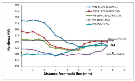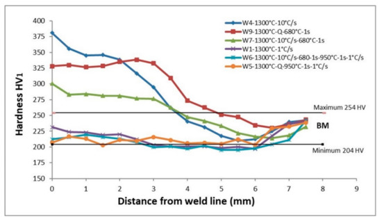 Of the welds that had been cooled at a medium cooling rate (10 °C/s), W8 (hardness 258 HV