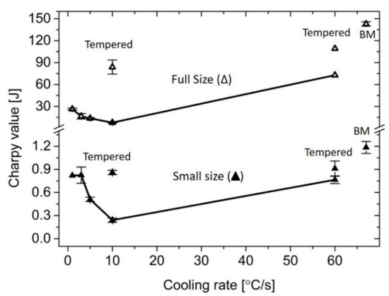 Figure 14 it is seen that the full size thermally weld simulated specimens that had been cooled from 1300 °C at a rate of 60 °C/s, possessed a higher toughness than the specimen that had been cooled at 1 °C/s. In Ref. [